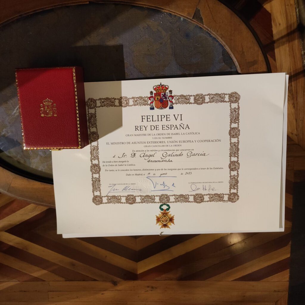 Don Ángel Galindo García, vicario general de la Diócesis de Segovia, ha recibido esta mañana en el Ministerio de Asuntos Exteriores la Medalla de la Orden de Isabel la Católica. Una condecoración que le ha sido otorgada en consideración a su labor en universidades de China e Hispanoamérica, así como a su servicio a los Santos Lugares a través del Patronato de la Obra Pía, al que pertenece al ser presentado por la Conferencia Episcopal Española.