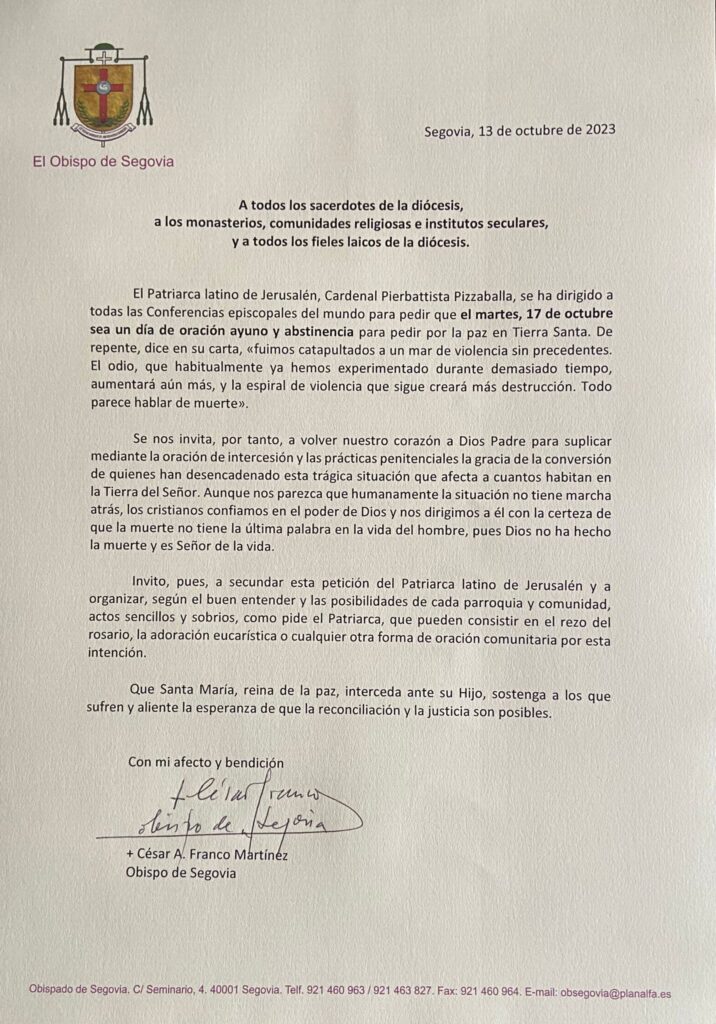 El Obispo de la Diócesis, Mons. César Franco, ha escrito una carta en la que realiza un llamamiento a los sacerdotes, monasterios, comunidades religiosas, institutos seculares y todos los fieles de la Diócesis. Don César nos pide que nos unamos a la jornada de oración, ayuno y abstinencia propuesta para el próximo martes 17 de octubre por el Patriarca Latino de Jerusalén, el cardenal Pierbattista Pizzaballa, por la paz en Tierra Santa.