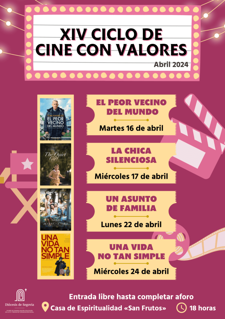 Un año más, y ya van catorce, la Vicaría de Evangelización propone una serie de películas en la XIV edición del Ciclo de Cine con Valores, organizado y coordinado por D. Jesús Riaza Cabezudo. En esta ocasión, las fechas elegidas son el martes 16 y el miércoles 17 de abril; y el lunes 22 y el miércoles 24 de este mismo mes.