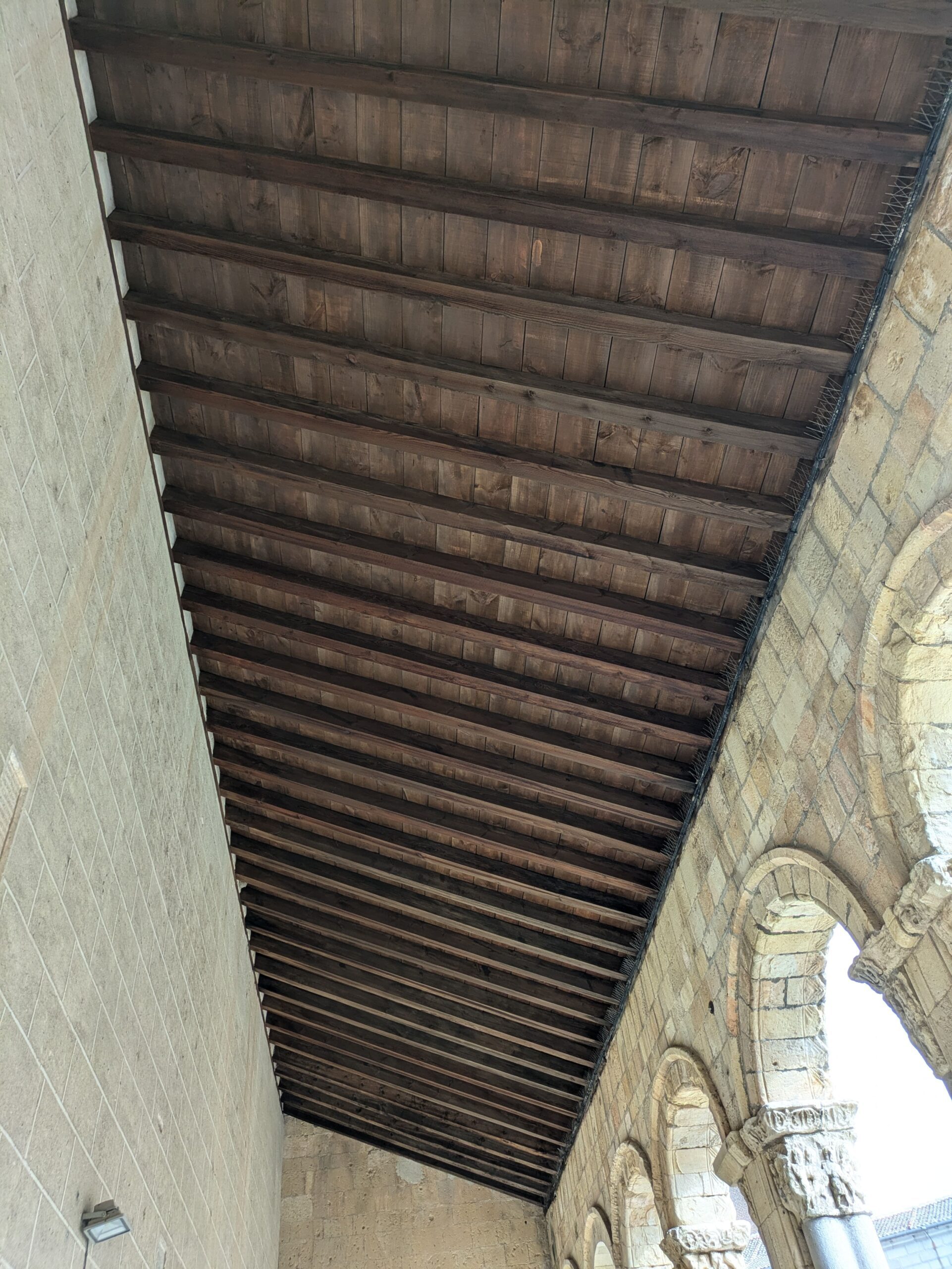 Asimismo, se ha procedido a restaurar y poner en valor la estructura de cubierta de madera vista del atrio, así como las cabezas de los pares de madera deteriorados por la humedad. Además de reparar la estructura metálica de la capilla de Hernando Díaz y de la retirada de la vegetación invasiva, se ha procedido a reformar la acera perimetral en las fachadas meridional y oriental, haciendo un seguimiento arqueológico de todas las labores de remoción de tierras.
