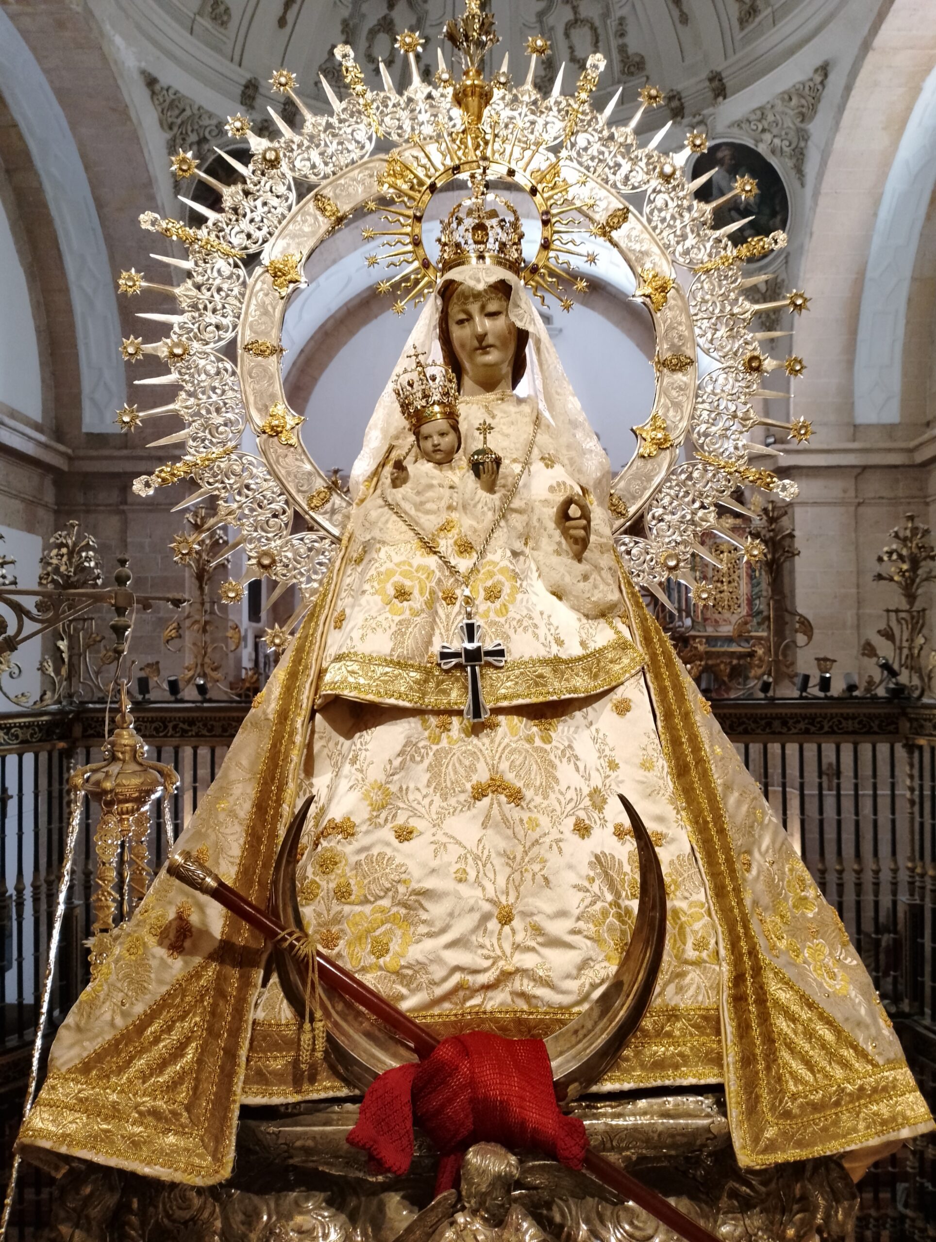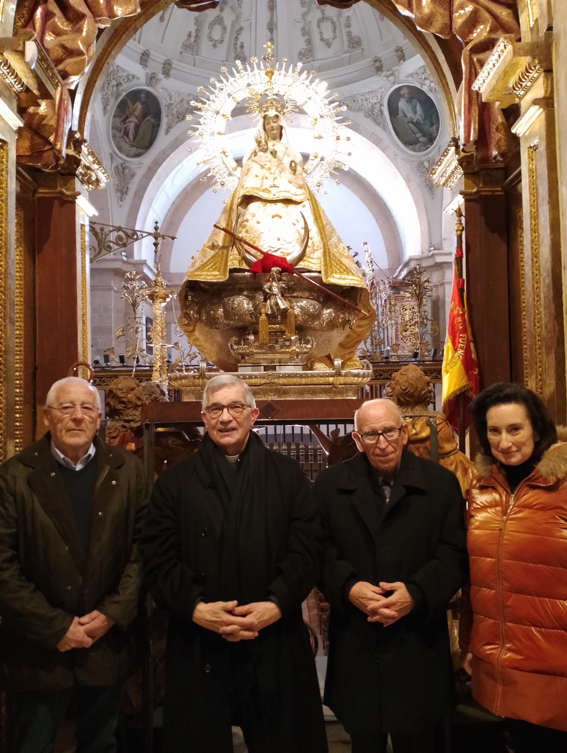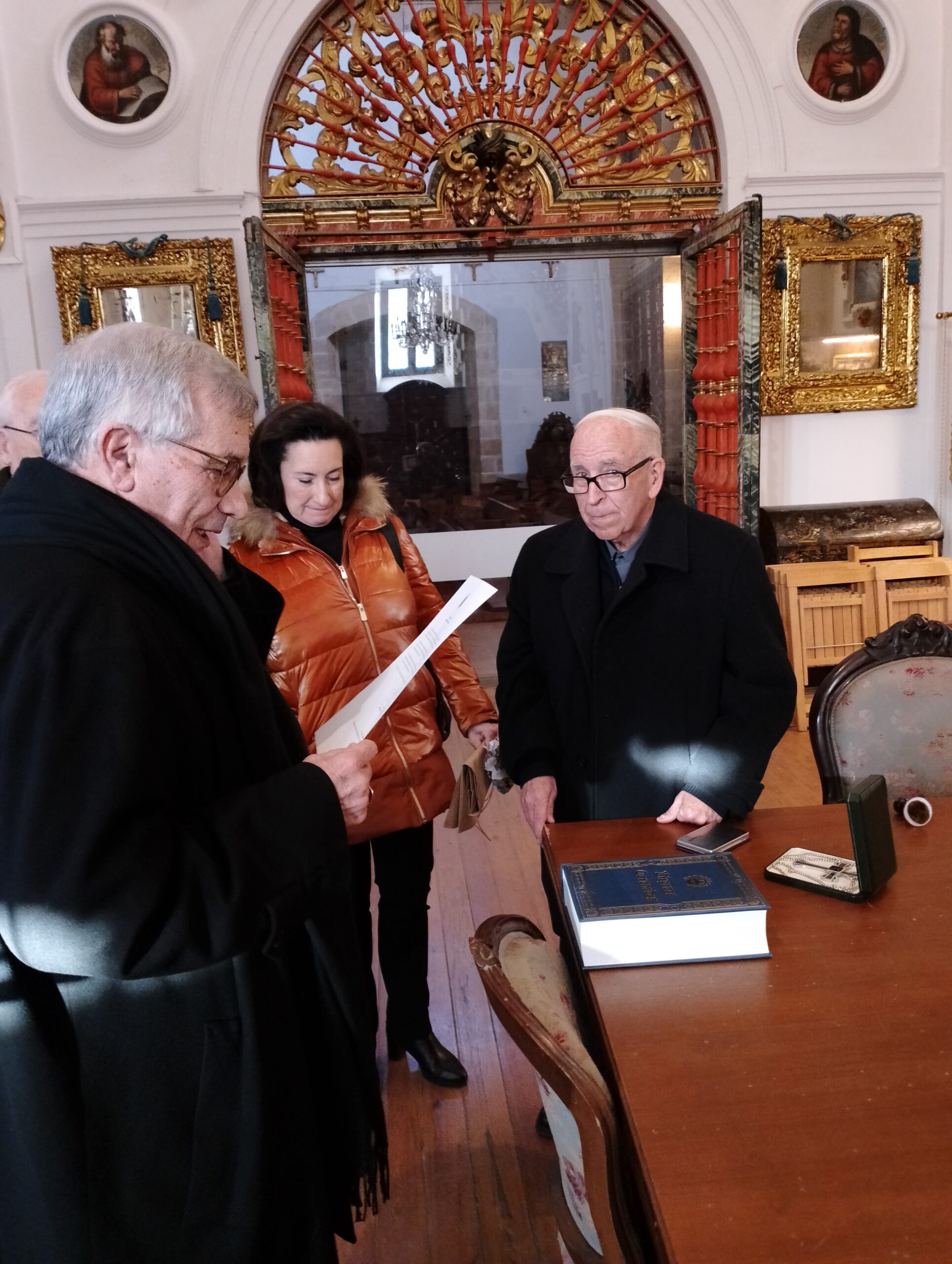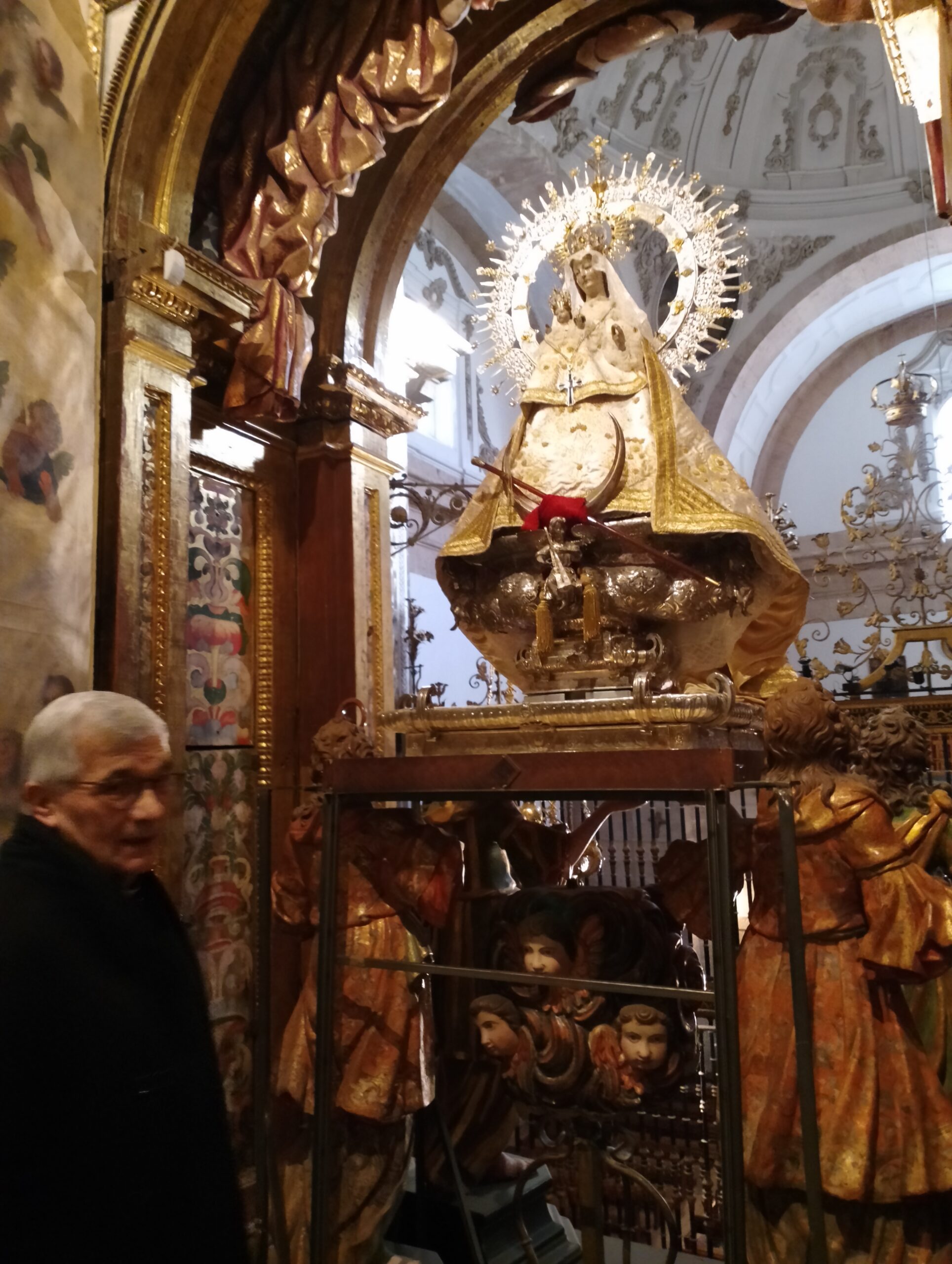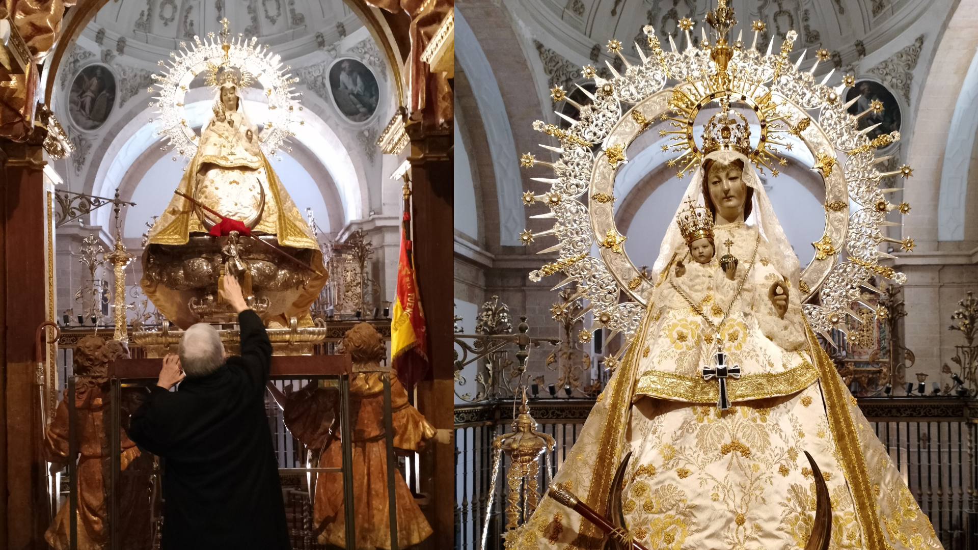 La lectura y firma del acta de donación por parte del propio D. César y D. Ángel Miguel Alonso, rector del santuario, tuvo lugar en la Sacristía Mayor para, a continuación, acceder al camarín. Allí, se rezó la Salve y se colocó el pectoral a la Virgen como muestra de agradecimiento tras la donación.