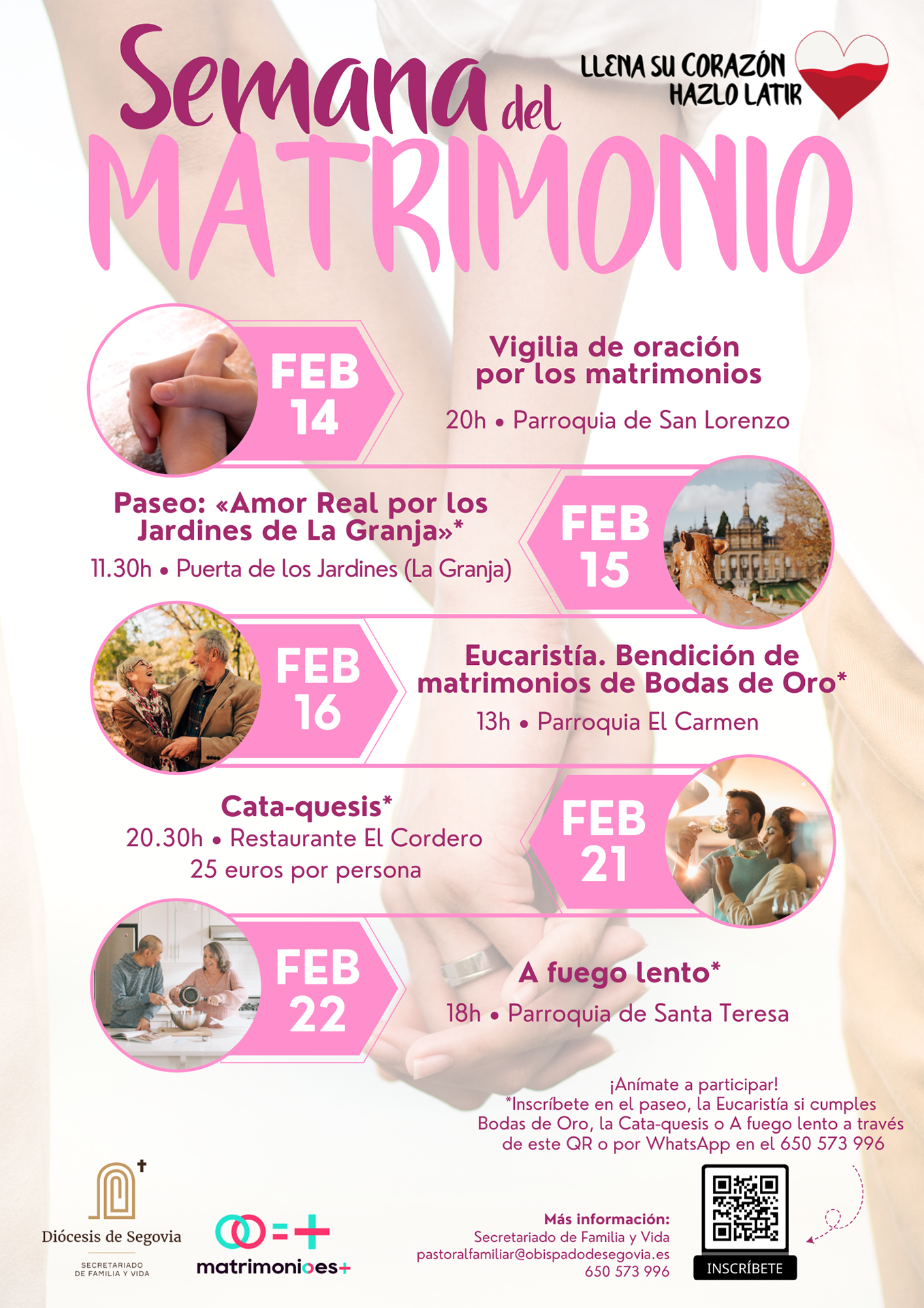Para todos aquellos interesados en participar en una o varias de estas actividades está disponible el formulario de inscripción, especialmente para el paseo, la cata-quesis y a fuego lento. Igualmente, para aquellos matrimonios que celebren sus Bodas de Oro, se agradece lo comuniquen a través del mismo formulario para que la organización pueda tener una previsión de asistencia. Para más información, se puede contactar con el Secretariado de Familia y Vida en el correo pastoralfamiliar@obispadodesegovia.es o en el teléfono 650 573 996.