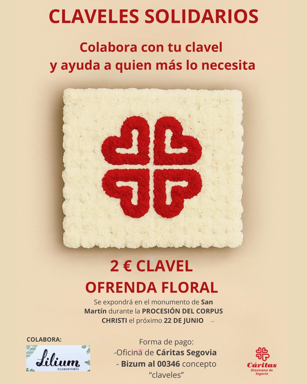 Cabe recordar que el domingo del Corpus, Cáritas celebra el Día de la Caridad así que, como parte de la expresión popular de fe, invitan a todos los fieles a participar en una emotiva ofrenda floral de claveles, que estará situada en la escalinata de la iglesia de San Martín, uno de los cuatro altares del recorrido procesional. El precio del clavel es de 2 euros por unidad, sin límite de cantidad y se podrá colaborar de diferentes maneras. Enviando un Bizum al 00346, indicando en el concepto CLAVELES; en persona en la sede de Cáritas hasta el viernes 20 o el propio domingo 22 de junio desde las 11 horas en la iglesia de San Martín.