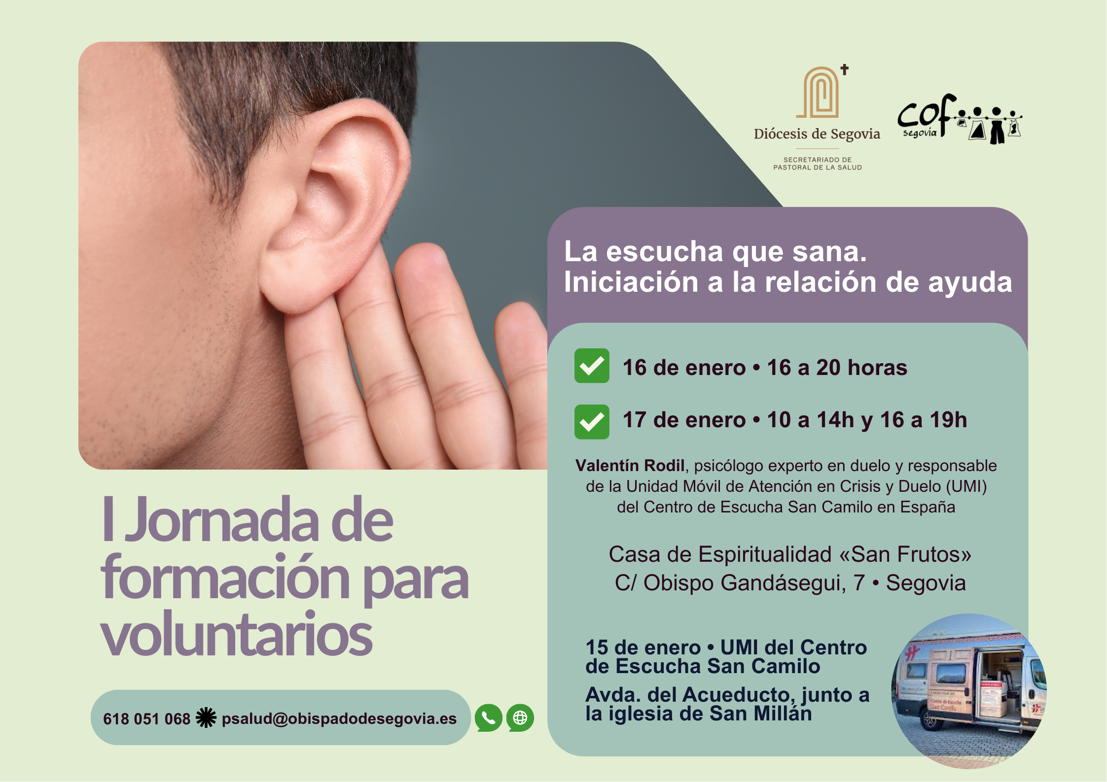 20260114 Formación para voluntarios. El Secretariado de Pastoral de la Salud de la Diócesis de Segovia, organiza la primera Jornada de formación para voluntarios bajo el título «La escucha que sana. Iniciación a la relación de ayuda», una propuesta formativa orientada a capacitar a quienes acompañan a personas en situación de sufrimiento, enfermedad o duelo.