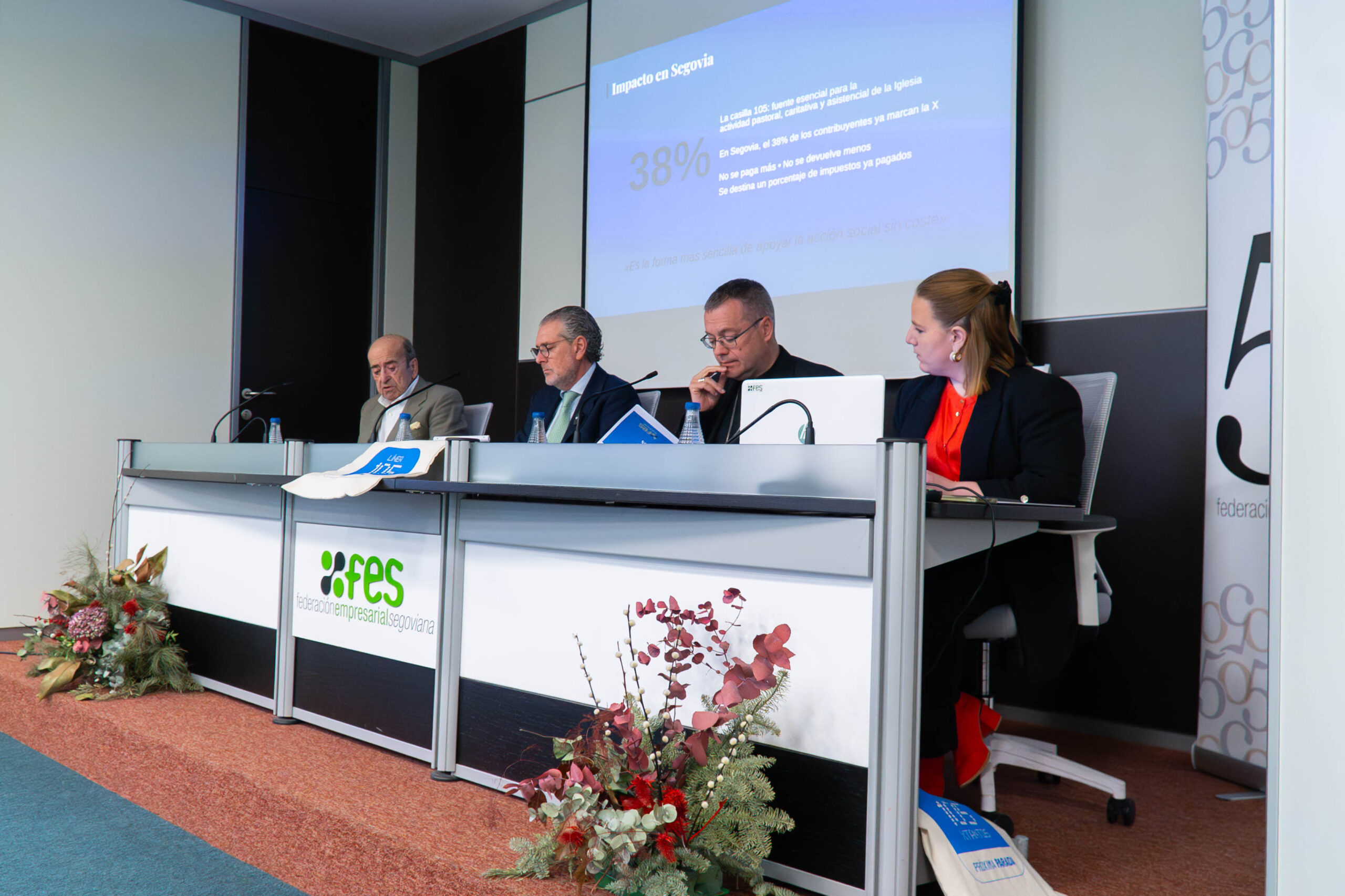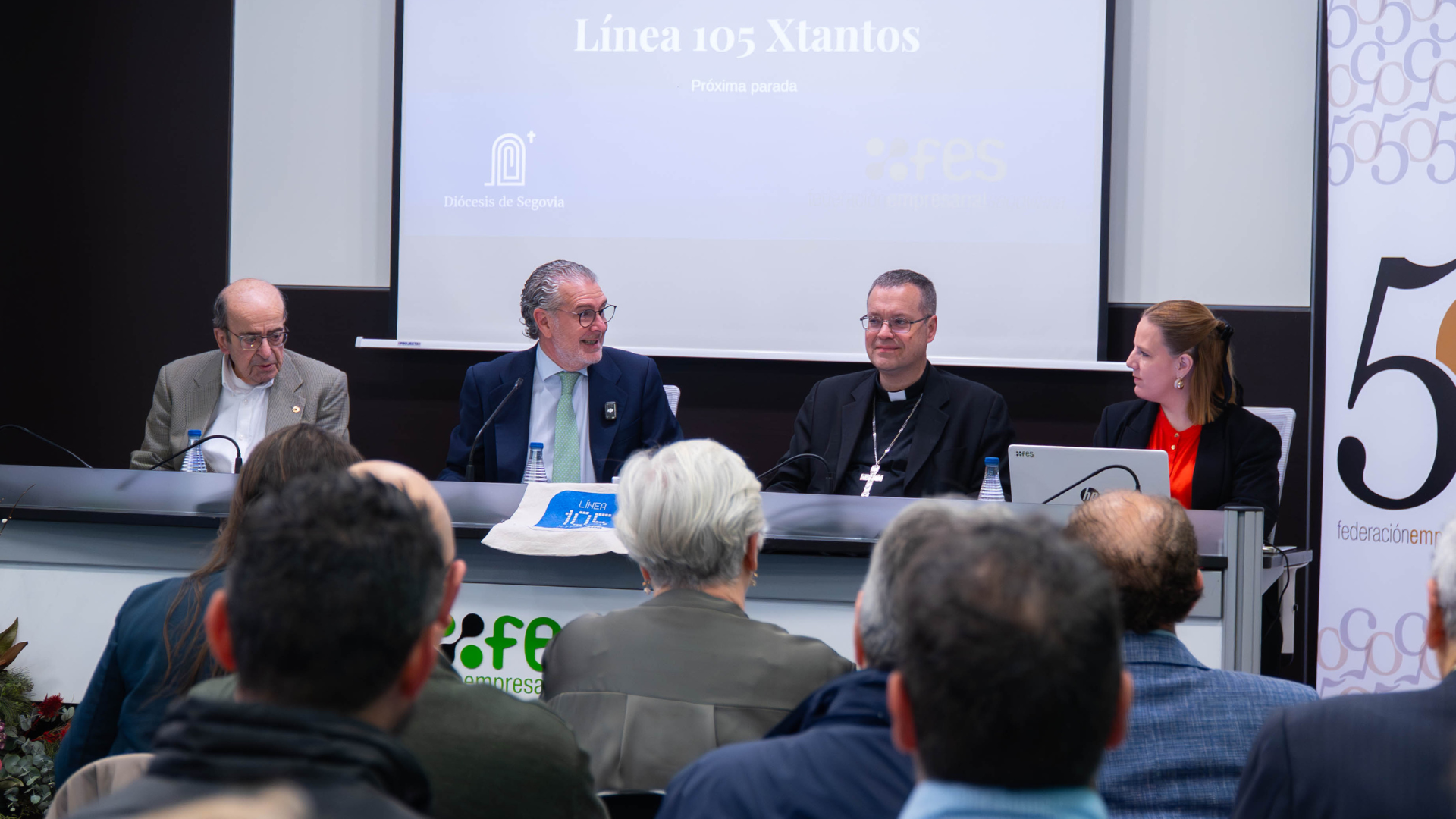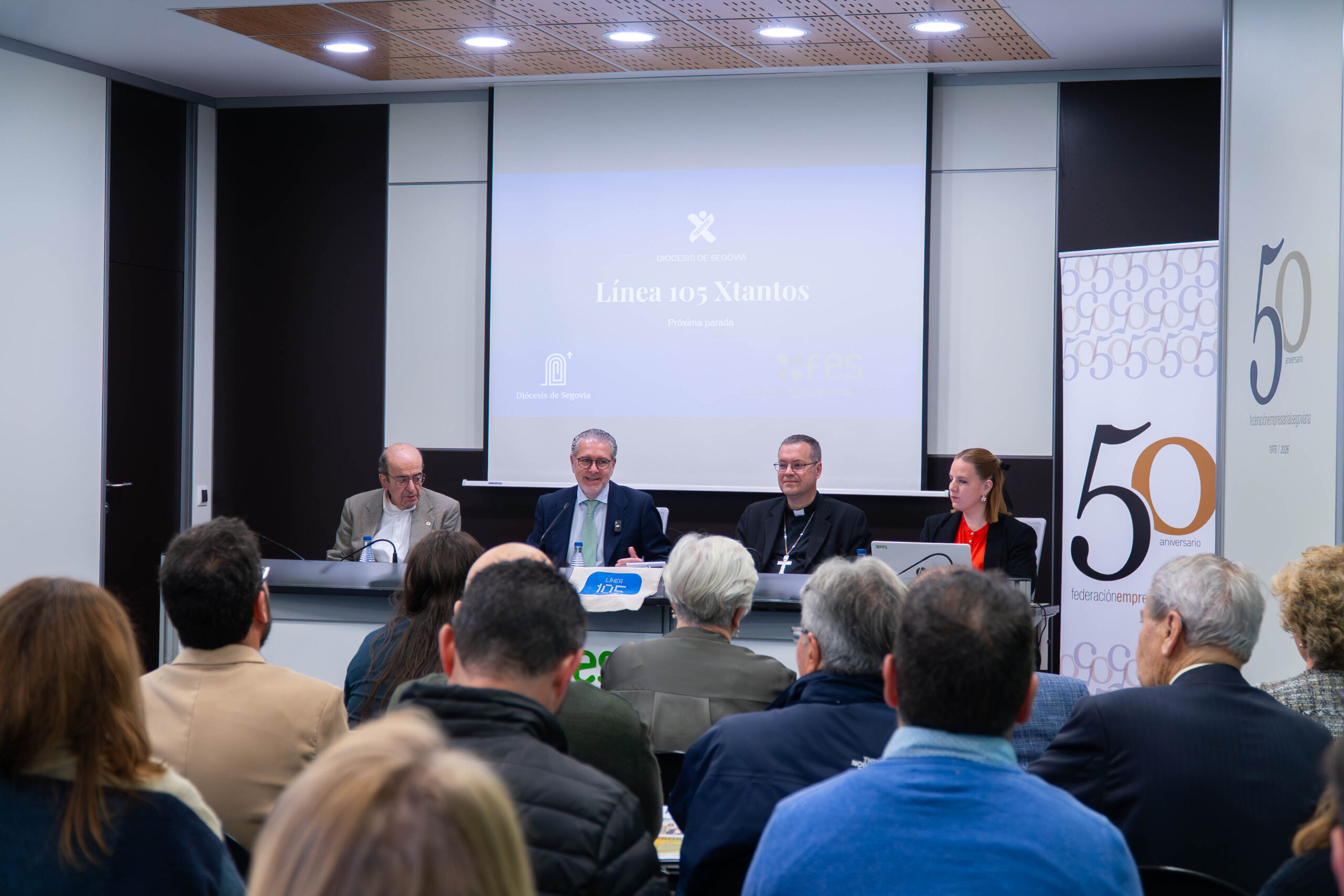 20260414 Línea 105 Xtantos. La Diócesis de Segovia ha presentado a los empresarios segovianos la campaña de la renta “Línea 105 Xtantos: próxima parada”, en un encuentro celebrado en la sede de la Federación Empresarial Segoviana (FES), al que han acudido más de medio centenar de empresarios de la provincia, representantes de distintos sectores del tejido productivo. Un encuentro que, como recordó Pedro Palomo, evoca el compromiso de los antiguos gremios que siglos atrás contribuyeron con su trabajo y sus recursos a grandes empresas comunes como la construcción de la Catedral.